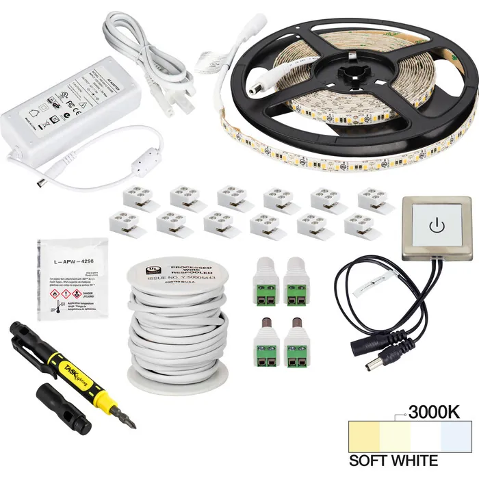 Everything needed to install 1 zone and 1 area of 16 ft of 12-Volt 225 Lumens/Ft Single-White LED Tape Lighting with a wired Touch Dimmer Switch in one box. Contains one 16 ft roll of 12-Volt 225 Lumens/Ft Single-White LED Tape Lighting with 3M Ultra Bond double-stick tape for peel-and-stick installation, 60W power supply, two 6-packs of 8 mm-EZ connectors, 25ft of wire, touch dimmer switch, two each male/female barrel-to-wire connectors screwdriver, and adhesive promoter wipe. Cut the tape light to length to achieve beautiful, even lighting in any space. IP65 Waterproof rated tape light. Field cut at 2" cut lines. On/off/dim functionality with included touch dimmer switch. Plug-in power supplies allow for installation without an electrician.36 diodes per foot (600 per roll) create even illuminationUL Listed or recognized components to keep inspectors satisfied90+ CRI tape light for true rather than faded colors30,000 hour LED life at 70% lumen maintenance means long-lasting illumination3M 300LSE waterproof adhesive tape for improved adhesive to surfaces, plus adhesive promotor surface preparation wipe includedAluminum housings available, ordered separatelyDimmable with included touch dimmer switch
