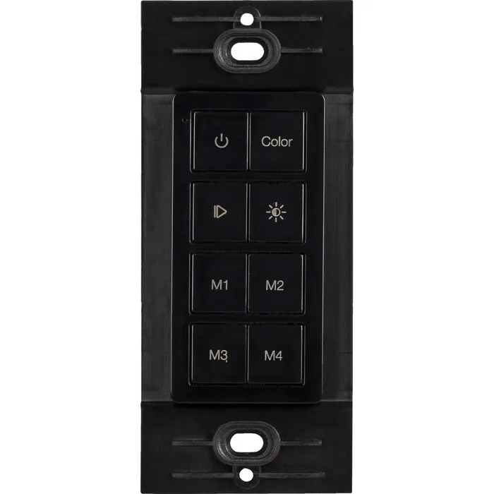 Chroma RGB 1 Zone wireless controller, used with the Chroma RGB wireless receiver or WAV Smart RGB Receiver for wireless control of the RGB Inferno tape lighting. Can be wall mounted behind a standard decora switch plate.Control RGB Color Changing lighting wirelesslyAttaches to mounting plate with a simple magnet for easy, yet mobile controlFits perfectly into a standard Decora style switch plate, not included, without the need for cutting into sheet rockBattery is only consumed while buttons are pressed, meaning years of battery lifeFull-range brightness and non-white color controlMemory buttons to save up to four favorite colorsSingle-touch pairing with wireless receiver for easy installation