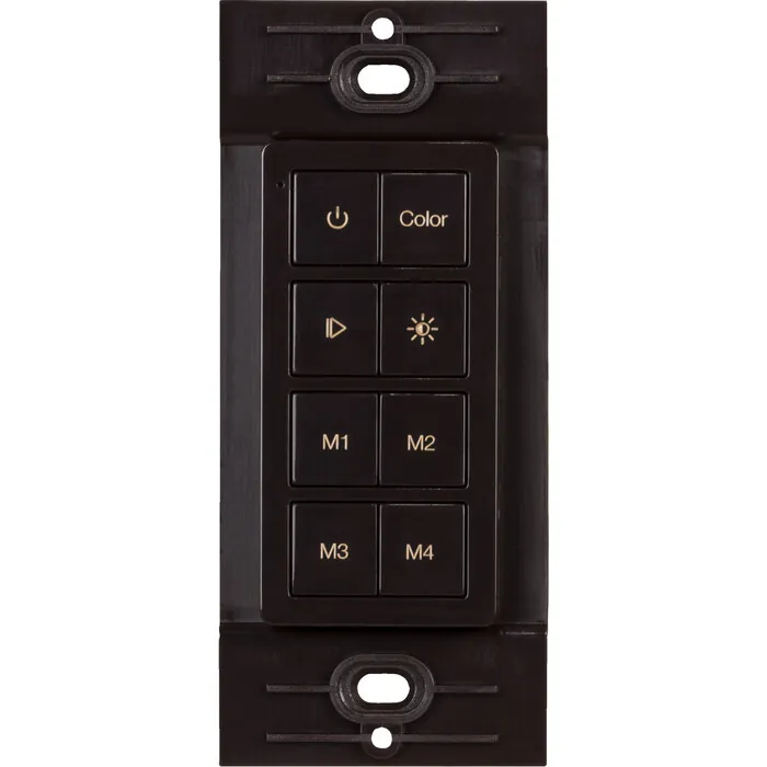 Chroma RGB 1 Zone wireless controller, used with the Chroma RGB wireless receiver or WAV Smart RGB Receiver for wireless control of the RGB Inferno tape lighting. Can be wall mounted behind a standard decora switch plate.Control RGB Color Changing lighting wirelesslyAttaches to mounting plate with a simple magnet for easy, yet mobile controlFits perfectly into a standard Decora style switch plate, not included, without the need for cutting into sheet rockBattery is only consumed while buttons are pressed, meaning years of battery lifeFull-range brightness and non-white color controlMemory buttons to save up to four favorite colorsSingle-touch pairing with wireless receiver for easy installation
