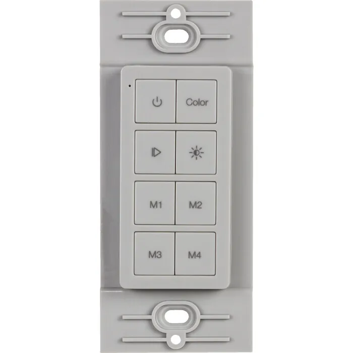 Chroma RGB 1 Zone wireless controller, used with the Chroma RGB wireless receiver or WAV Smart RGB Receiver for wireless control of the RGB Inferno tape lighting. Can be wall mounted behind a standard decora switch plate.Control RGB Color Changing lighting wirelesslyAttaches to mounting plate with a simple magnet for easy, yet mobile controlFits perfectly into a standard Decora style switch plate, not included, without the need for cutting into sheet rockBattery is only consumed while buttons are pressed, meaning years of battery lifeFull-range brightness and non-white color controlMemory buttons to save up to four favorite colorsSingle-touch pairing with wireless receiver for easy installation