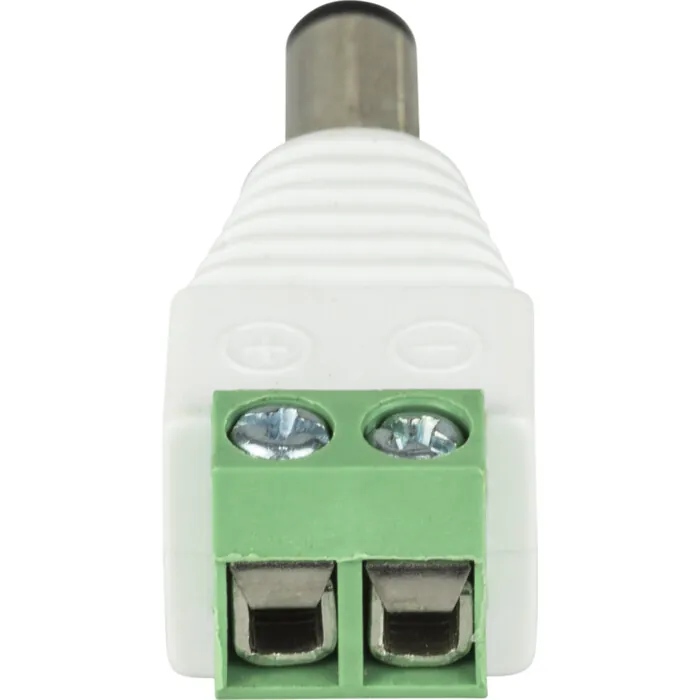 Male barrel-to-conductor screw down connector. 5 amp maximum load.