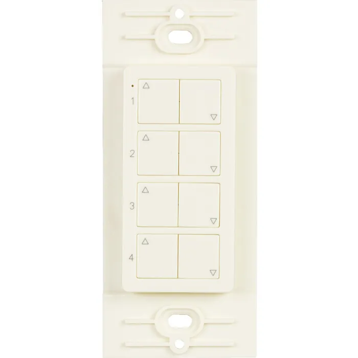 Wireless Quattro 4 Zone wall dimmer. Used with the wireless receiver, WAV Smart Receiver/Power Supply Combo, WAV Smart Receiver, or 24V Smart Power Supply to wirelessly control and dim LED Lighting.Control LED lighting wirelesslyAttaches to mounting plate with a simple magnet for easy, yet mobile controlFits perfectly into a standard Decora style switch plate, not included, without the need for cutting into sheet rockBattery is only consumed while buttons are pressed, meaning years of battery lifeFull-range brightness and on/off controlSingle-touch pairing with wireless receiver for easy installationControl up to four zones of lighting from one wireless controller