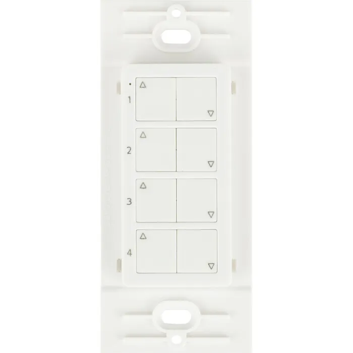 Wireless Quattro 4 Zone wall dimmer. Used with the wireless receiver, WAV Smart Receiver/Power Supply Combo, WAV Smart Receiver, or 24V Smart Power Supply to wirelessly control and dim LED Lighting.Control LED lighting wirelesslyAttaches to mounting plate with a simple magnet for easy, yet mobile controlFits perfectly into a standard Decora style switch plate, not included, without the need for cutting into sheet rockBattery is only consumed while buttons are pressed, meaning years of battery lifeFull-range brightness and on/off controlSingle-touch pairing with wireless receiver for easy installationControl up to four zones of lighting from one wireless controller