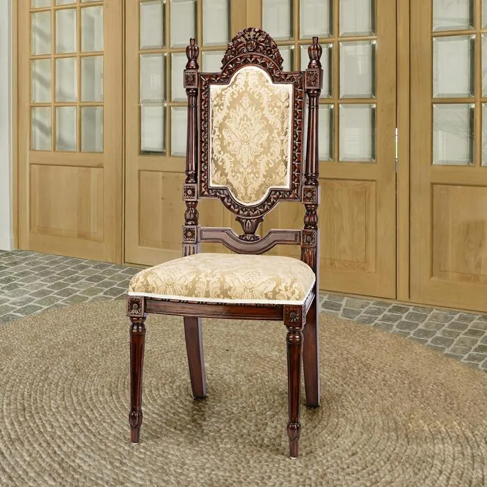 Replicating a 19th century French antique, the deeply handcarved roses, ribbons and palms handcarved into this solid mahogany chair gives it the distinctive authenticity of rich period furniture. Hand upholstered front and back in ivory tone-on-tone fabric, this Toscano exclusive garners raves for its style and comfort. From the rosebud finials to the slender, hand-turned legs, this chair glows in a rich, hand rubbed finish. 19"Wx20"Dx44&frac12"H. 20 lbs.