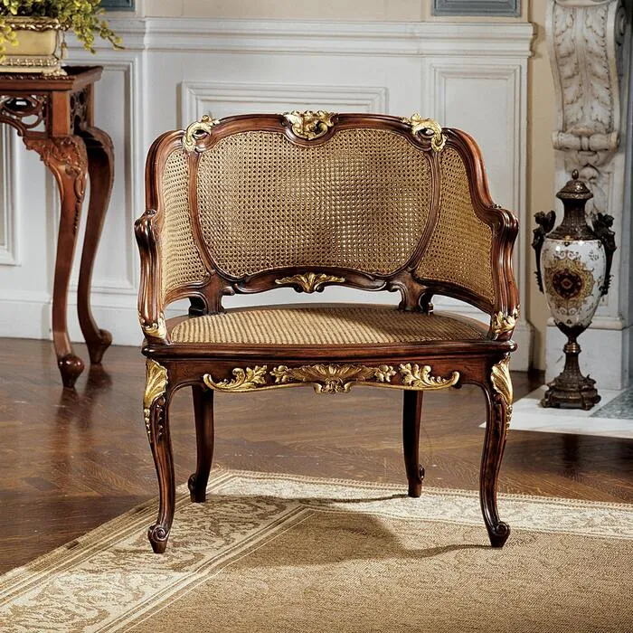 In the true Rococo style of Louis XV, deeply handcarved roses and leaves play across the frame of rich solid mahogany that holds an expanse of double caned rattan in this oh-so-French chair. Just like one you'd see in any fine 18th century Parisian home, our exclusive is accented with gold gilt to bring out the depth of the carvings and blend with your other antiques. A functional work of furniture art, it brings authentic French style and sophistication to any room. 28"Wx21½"Dx31"H. 14 lbs.