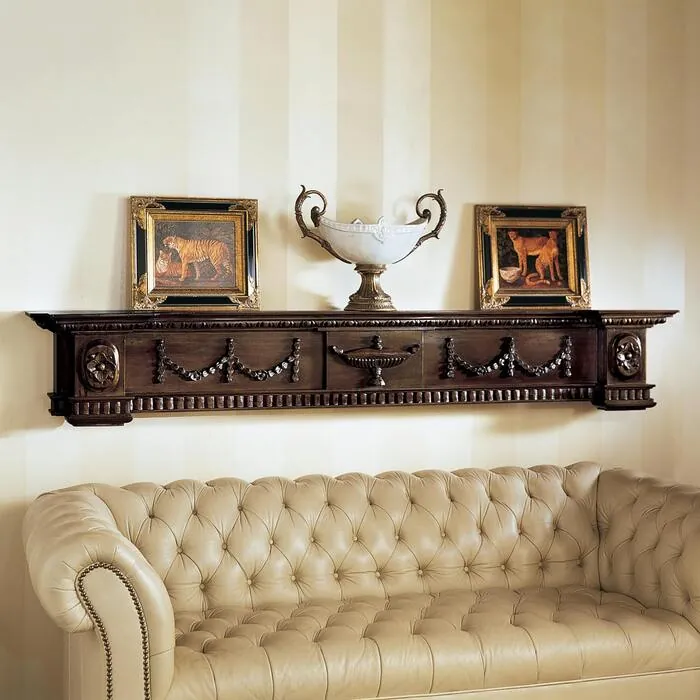 This architectural pediment in the Neoclassic style displays many handsome features including an acanthus swag, deeply carved rosettes and dentil molding. At six-and-a-half feet long this handcarved mahogany mantel piece is a fine replica of 18th century craftsmanship and takes over two days to carve. But don't limit its uses to the fireplace; as a shelf over a couch, a tapestry or along a hallway, it adds architectural character to any room. A Design Toscano exclusive. Does not include hardware or instructions for hanging; we recommend having this pediment installed by a professional. 79½"Wx9"Dx12½"H. 37 lbs.