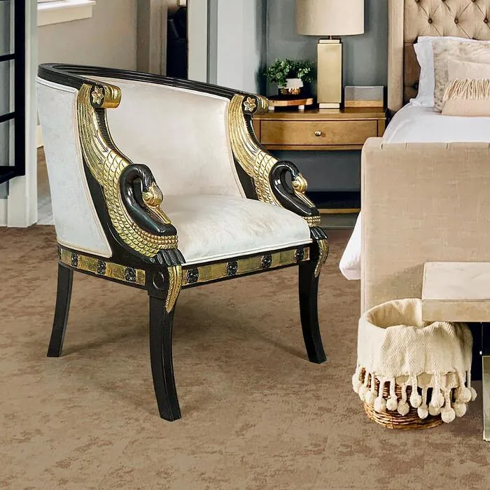 This exquisite, early 19th century Neoclassical Italian-inspired tub chair boasts two intricately hand-carved swans whose wake wraps to form a gently bowed backrest. You'll sink into the comfortable suspension, upholstered front and back in a quality, creamy ivory colored velvet. Our exclusive chair boasts an ebony finish accented by hand-crafted golden-gilded accents that set off the quality swan carvings in solid mahogany. This stylish, period work of furniture art enhances its historic lines and adds to the deep-seated comfort of this Design Toscano exclusive created by our master carvers. 26½"Wx28½"Dx33½"H. 31 lbs. Seat Dims: 21½"Wx20½"D. Floor to Top of Seat: 18½"H. Back Rest Height: 15"H. Leg Height: 11"H.