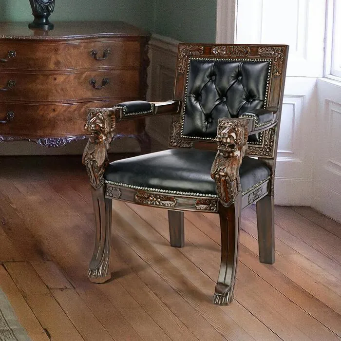Ebony, button-tufted real leather and individual hand-tacking work in concert to create a Gothic masterpiece that's one of the most handsomely masculine chairs in our collection. Our master craftsmen have painstakingly hand-carved each armchair with lions' heads atop the padded arms and with claw feet at the base before adding a dark, hand-rubbed finish to bring out each detail. Like the early 15th-century originals that have long lined the halls of stately castles, our deeply padded, Design Toscano-exclusive has all the authenticity of a fine period antique. 25½"Wx24½"Dx36½"H. 22 lbs.
