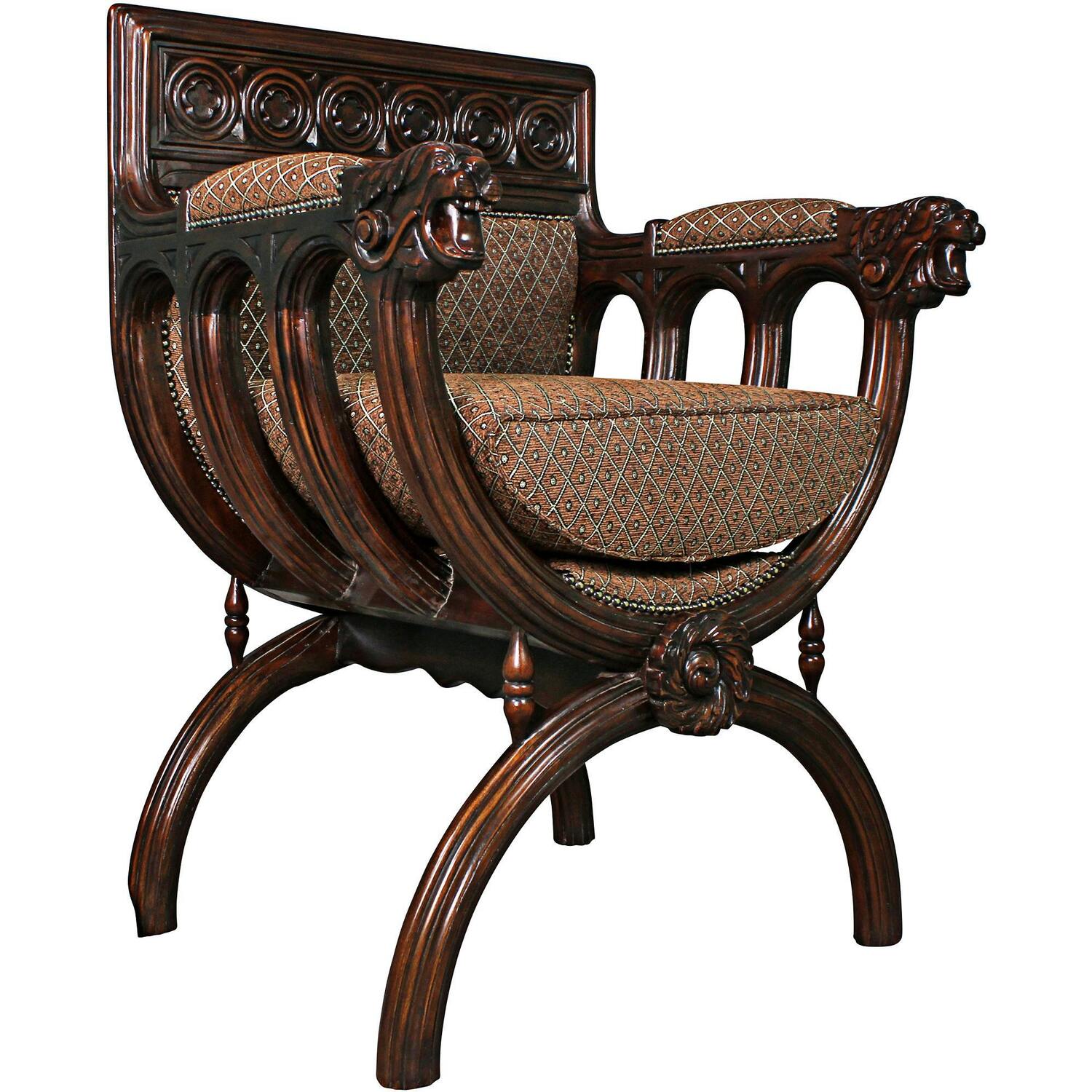 A synergy of hand-carving and fine upholstery highlights the Gothic influence of this Renaissance-style x-cross chair once reserved for the public occasions of revered magistrates and noted nobles. This magnificently hand-carved, solid mahogany replica chair boasts deeply carved lions heads with bared teeth and Gothic rosettes, while the generous expanse of luxurious brown and antique gold patterned upholstery highlights both front and back of its dark brown finish. Welcome guests with this Design Toscano-exclusive Medieval accent chair perfect for formal living area or regal boudoir. 27"Wx25½"Dx39½"H. 35 lbs.