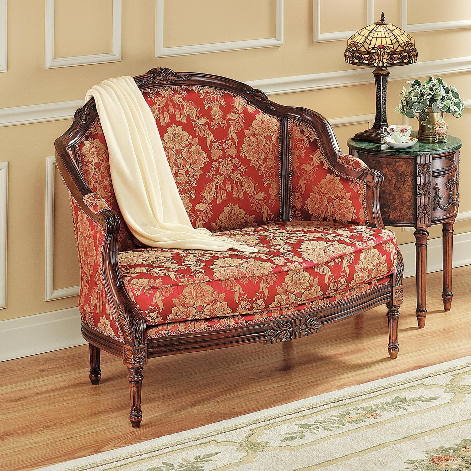 If you simply sink into the perfectly plush comfort of the floral jacquard upholstery, you'll miss the fancy detailing and richly hand-carved solid mahogany designs in this loveseat's floral skirt and pediment top. From its padded, hand-tacked armrests to its shapely carved legs, our Design Toscano-exclusive couch is true French salon style perfectly sized for a lover's niche. 45½"Wx31½"Dx41½"H. 29 lbs.
