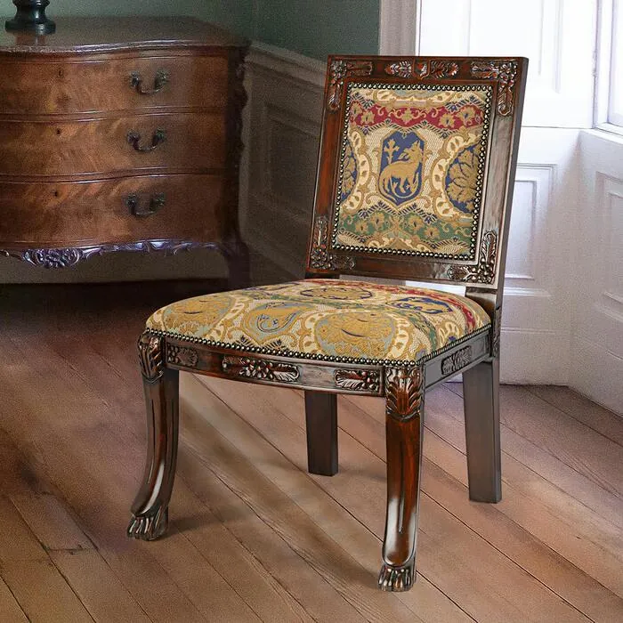 This handsome Gothic side chair replicates early 15th-century originals that have long lined the halls of stately castles. Our master craftsmen have painstakingly hand-carved each side chair with scrolled foliate carvings and claw feet at the base, this richly detailed solid mahogany side chair features a hand-rubbed finish. Deeply padded, welted faux tacked and a multi-colored coat of arms jacquard tapestry, upholstered on front and back, give it all the authenticity of a fine period antique. Our Design Toscano-exclusive armchair transforms any dining room into a Medieval banquet! Side Chair: 24" W x 21" D x 36" H. 20 lbs.