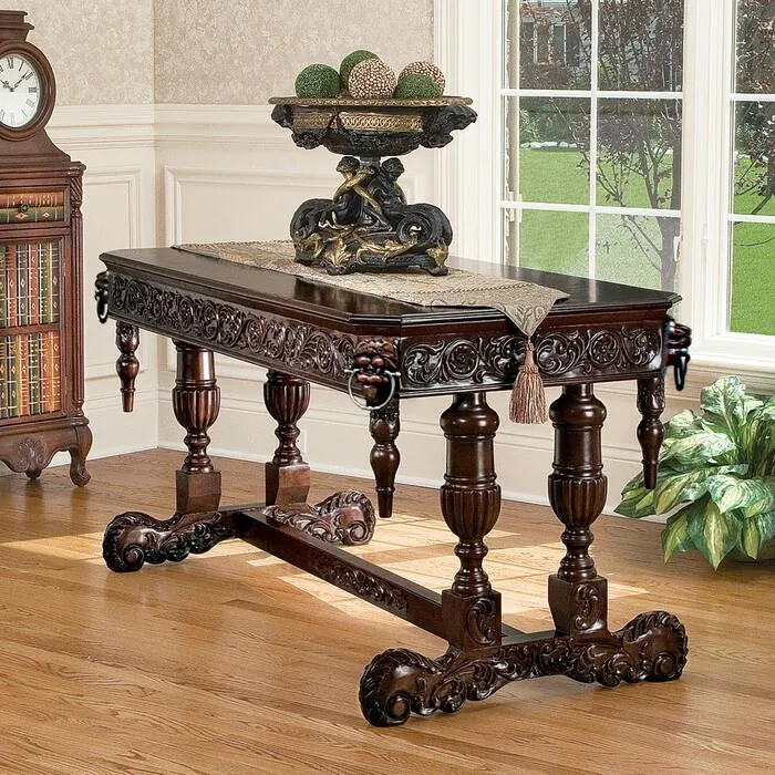 Almost five full feet of ornately hand-carved lions heads with teeth bearing metal rings, acanthus leaves and ornate turnings embellish everything from the balustrade's gadroons to the half-foot wide apron on this Design Toscano signature piece! Whether it serves in the library, entry or office, our solid mahogany desk is stylishly distinctive. Requiring well over a week of skilled hand-carving to create, this grand-scale investment in historic furniture art is a celebration of the decorative architecture of the Renaissance. Simple assembly required. 59"Wx28½"Dx30½"H. 112 lbs.