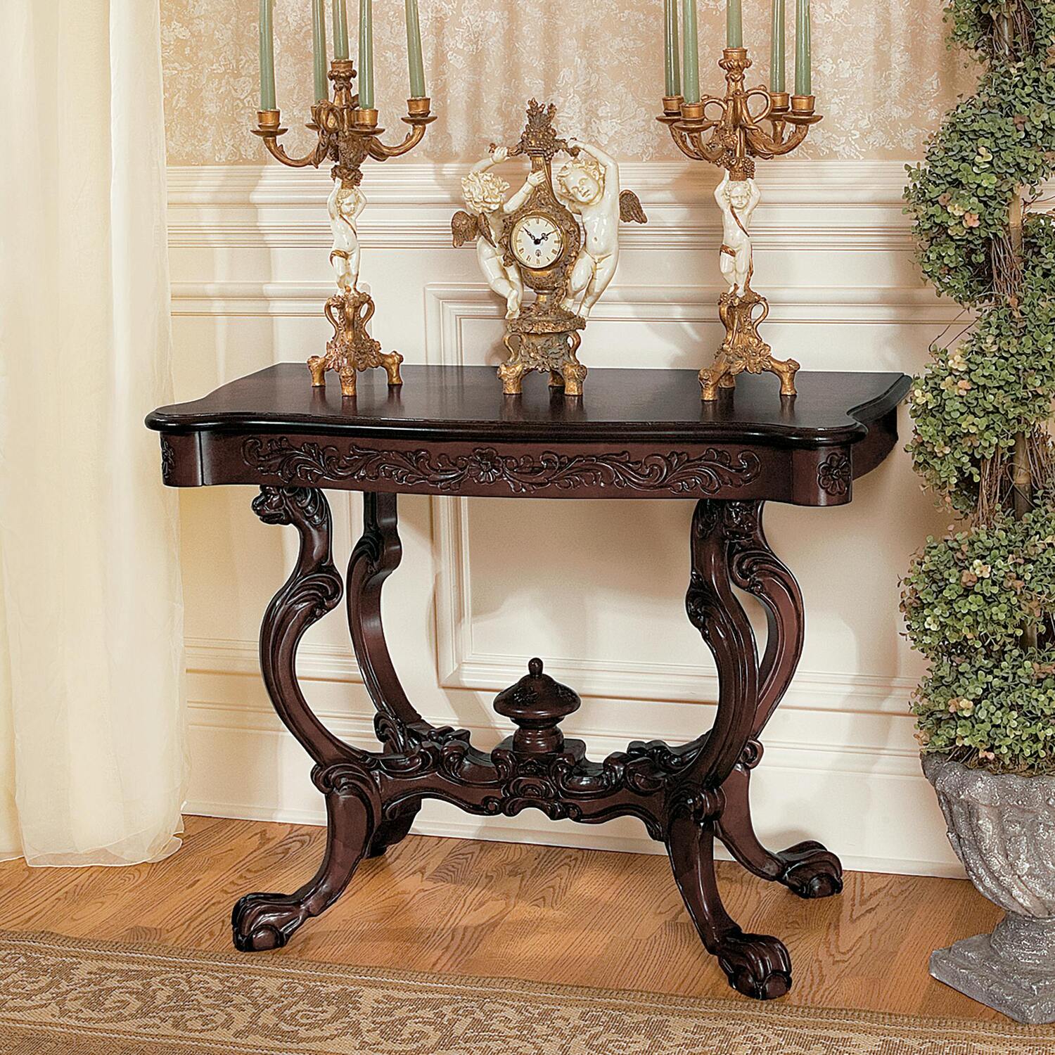 Boasting a sensuously hand-carved serpentine front and a prim center acorn finial, this classic furniture piece belies its origins as an English console table. Our Design Toscano-exclusive antique replica is embellished with lion topped scrolled legs atop claw-and-ball feet and requires a full week of hand-carving. Our polished mahogany work of furniture art has a flat back, making it a desirable addition in smartly appointed hallways or as a stylish sofa table. Simple assembly required. 39½"Wx19½"Dx30½"H. 44 lbs.