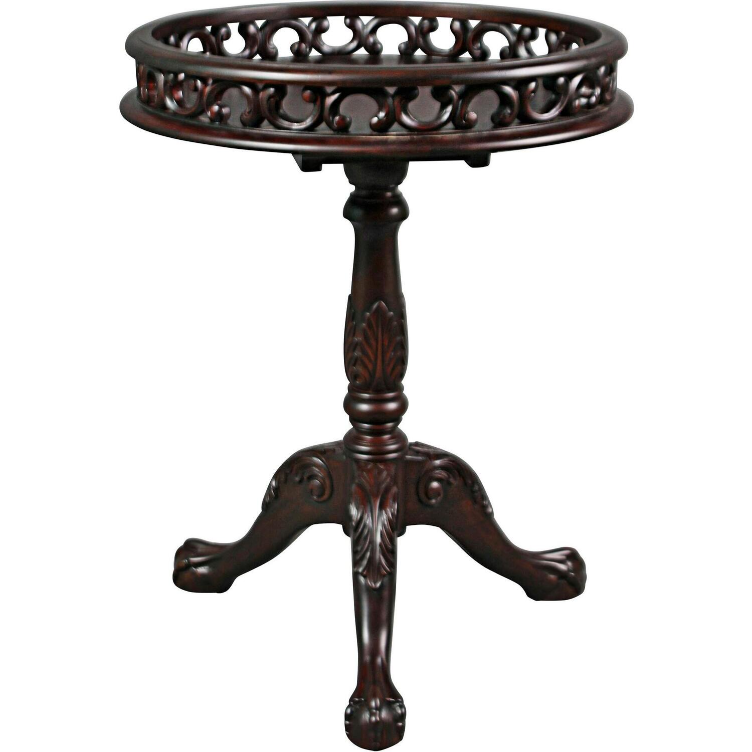 A tiered, acanthus-laden center baluster with tripod claw and ball feet rises to be crowned by a deeply raised gallery, hand-carved pie crust top in this elegant mahogany table replicating a true 18th century antique. This enduringly stylish Design Toscano exclusive holds a reading light as elegantly as an afternoon respite of tea and scones. Delightful! 23½"dia.x30½"H. 22 lbs.