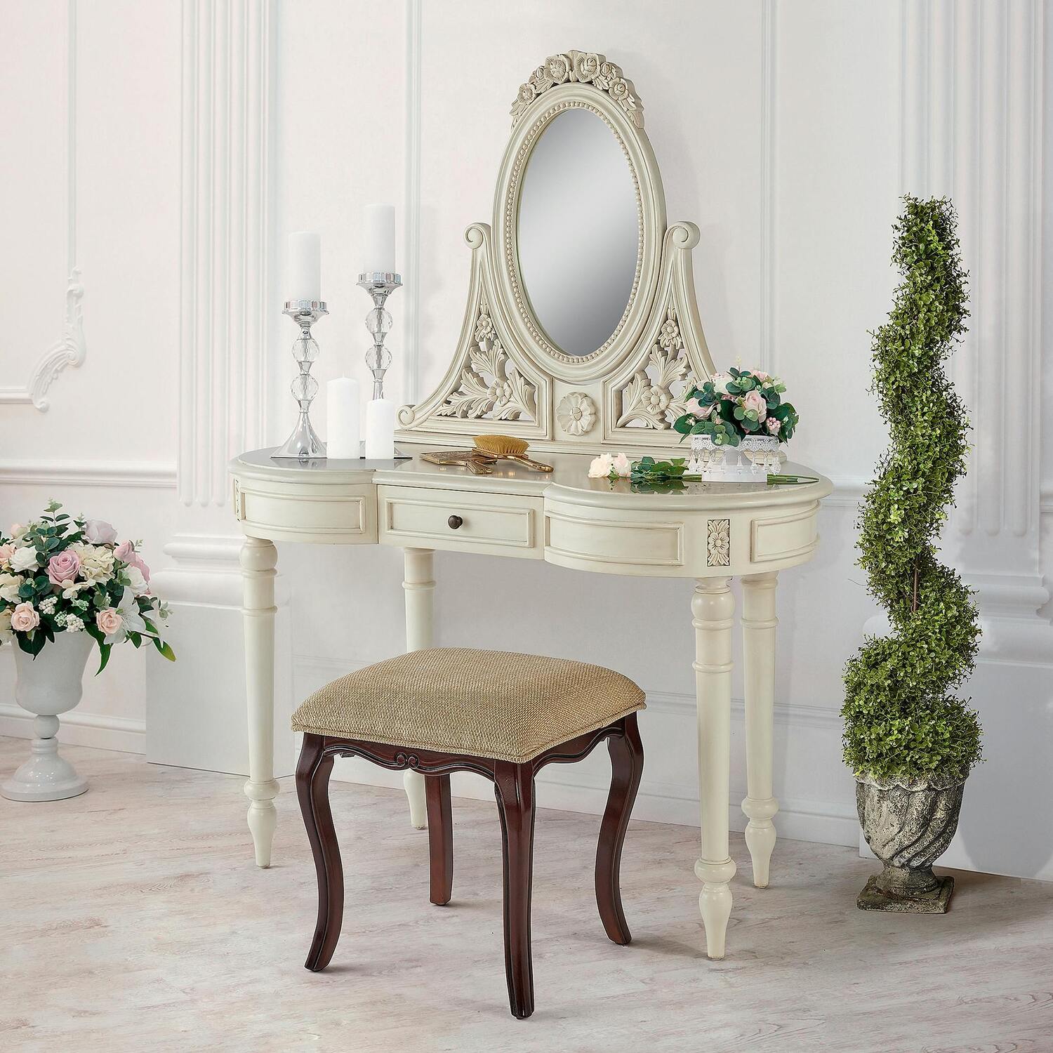 One almost forgets to look into the beveled, bead-rimmed mirror when there are so many other glorious details to admire in this gorgeous French vanity dressing table! Rising from Victorian turned legs toward a curved front with single, metal-pulled drawer, our Design Toscano exclusive gives way to an expansive, almost 4-foot long hardwood top accented by a filigree scrolled-front with stunning floral crown detail. Created of solid mahogany with a rich cream finish, this eye-catching work of furniture art is a classically feminine piece with Victorian flair. Simple assembly required. 45½"Wx19"Dx57½"H. 46 lbs.