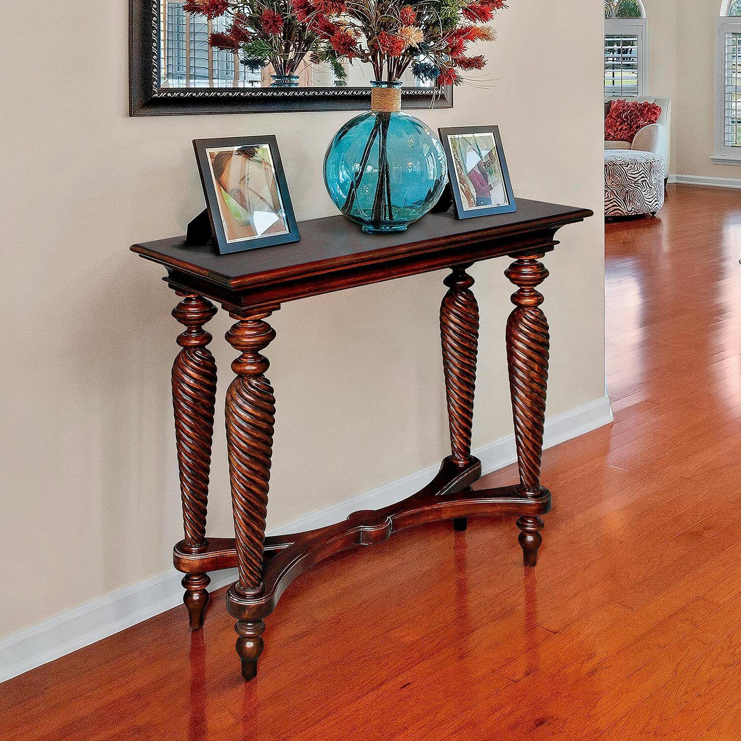 Look at those legs! Almost a full yard of dramatically hand-carved mahogany stretches out in this attention-getting work of furniture art that serves as everything from a beautifully functional console to an entryway table. With graceful architecture all its own, it rises from an x-frame stretcher on four turned spiral, fluted, and hand carved legs. Its long hardwood tabletop makes it a versatile piece in an entertaining area, home office or dining room. This polished mahogany work of furniture art was created exclusively for Design Toscano. 35"Wx16"Dx35"H. 35 lbs. Leg Height: 5½"H. Space Between Legs: Front: 23¼" Left: 4½"