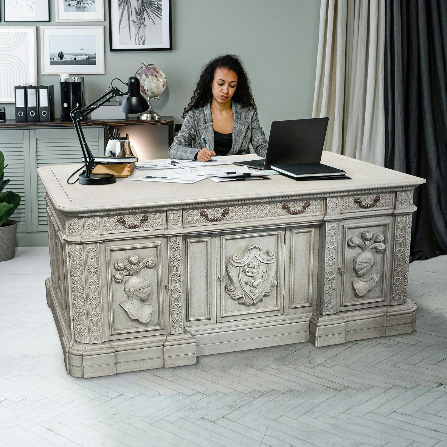 What a statement piece for home or office! Anchored by deeply hand-carved Celtic knotwork drawers, and a center panel featuring a grande heraldic lion shield, this classic executive desk is flanked by key-locked back doors boasting bookend knight helms serving as testament to the Gothic revival nature of this work of furniture art. Coaxed from mahogany and stretching two yards wide, this extraordinary heraldic piece boasts ornate metal handles along with three shallow drawers in the back, and faux drawers in the front. Letter and file drawers are discreetly hidden behind Knight helms key-locked back doors with ornate metal pulls. Our Design Toscano exclusive is in the tradition of amazing hand-carved desks used by authors for penning novels and captains of commerce tending to the management of a successful business. This classical British-style piece is hand-finished in a putty tone to replicate a true antique. A desk that is as stunning as it is functional! Simple assembly required.