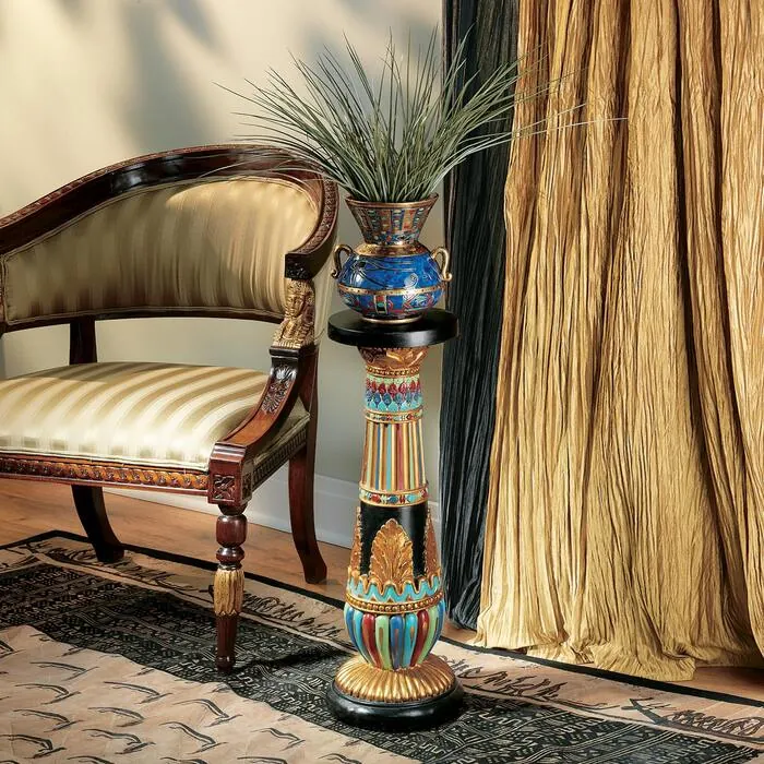 Though the fabled columns at Luxor are now weathered with age, our replica pedestal has "restored" the columns to the full splendor of the 18th dynasty. Hand-painted in the original Egyptian palette, you'll love displaying your treasures atop this extraordinary, two-foot-tall, designer resin work adorned with period detail highlighted in faux gold leaf. 9"dia.x26"H. 10 lbs.