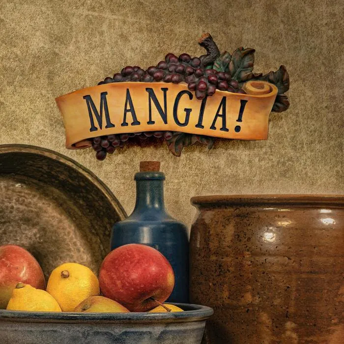 It's just what Grandmother used to say! "Mangia!" (Eat!) is proclaimed across kitchens in Italy and beyond. Evoke the warm feelings of a Tuscan kitchen with this scrolled, grape-laden wall plaque, cast in quality designer resin and hand-painted as a perfect gift for yourself or someone who always welcomes you warmly. .