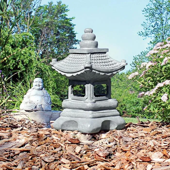 Add instant tranquility to your home or garden landscape with the timelessly elegant lines of the ancient pagoda. Falling from a central crown in an ever expanding cascade, this at-once modern work of antiquity is cast in quality designer resin with a dark gray stone finish for Basil Street Gallery. This Asian influenced lantern sculpture is a beauty that lends an elegant energy to your collectibles, whether near your favorite Buddha sculpture or in the cultivated flowerbed of a traditional Japanese garden. 7½"sq.x13½"H. 4 lbs.