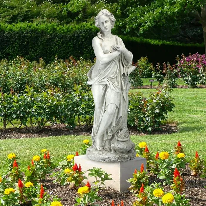 An allegory conjuring one of the goddesses of the seasons in the Neoclassical style, the Winter Goddess shows no produce and is striving to warm herself against the cold. Drawn from the Roman tales of the voluptuous goddesses known as the Horae, this classic lawn ornament is based upon an English estate original and is mesmerizingly detailed from draped gown to handsome face. Cast in quality designer resin, our Design Toscano classic sculpture is finished in antique stone for seasons of enjoyment. 12"Wx11½"Dx32½"H. 13 lbs.