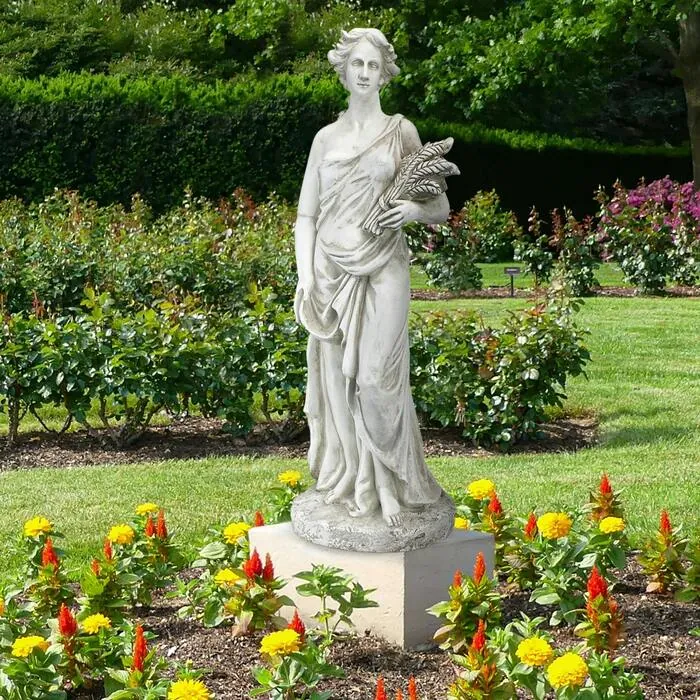 An allegory conjuring one of the goddesses of the seasons in the Neoclassical style, the Summer Goddess is holding a sheaf of harvested wheat. Drawn from the Roman tales of the voluptuous goddesses known as the Horae, this classic lawn ornament is based upon an English estate original and is mesmerizingly detailed from draped gown to handsome face. Cast in quality designer resin, our Design Toscano classic sculpture is finished in antique stone for seasons of enjoyment. 11"Wx11"Dx33"H. 12 lbs.