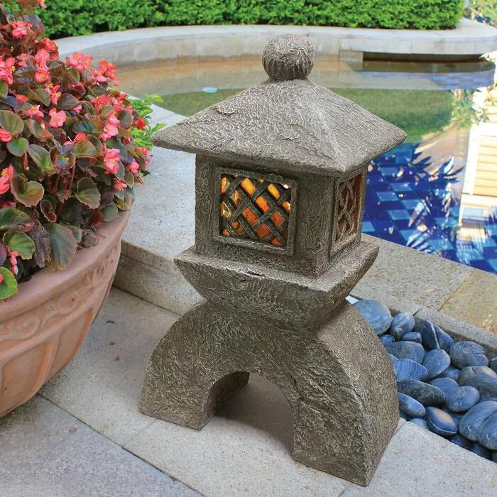 Usher in serenity and peace to your Zen, Japanese garden or other sacred space! A concealed, cordless solar light gently shines to highlight the graceful Asain shape of this rectangular, Design Toscano exclusive. We've carefully cast details from the hoshu kasa umbrella roof, the curved kidan legs and the hibukuro lattice front in quality designer resin with a textured, faux stone finish that makes our sculpture quintessentially Oriental! 11"Wx6"Dx16½"H. 4 lbs.
