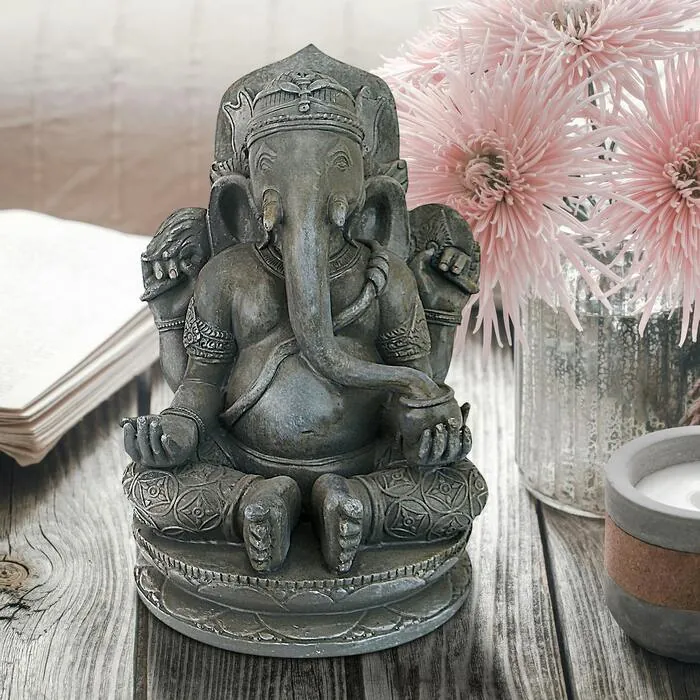 The son of Shiva and Parvarti, Ganesha, the elephant-headed god, is one of the most powerful, peaceful, and wisest of all Indian gods. With his large elephant ears to hear all, his trunk symbolizing strength, and his large head representing wisdom, he is worshiped as the god of prosperity, fortune and success. Our Design Toscano Ganesha statue is cast in quality designer resin and hand painted with a blue-grey stone finish. Commemorate births, anniversaries, weddings, or even celebrate diwali, the festival of lights, with our peaceful, meditative sculpture. 7½"Wx7½"Dx11"H. 3 lbs.