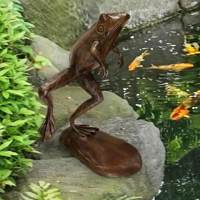 When you see this realistic, piped bronze, spitting frog statue captured in full leap, it might just make you do a double-take! Tucked between the flowers as a bronze garden sculpture or spitting water straight into your backyard pond, our Design Toscano-exclusive heavyweight, bronze frog statue, is a fanciful addition to your favorite pond, fountain or flowerbed! Our spitting frog bronze statue boasts a hand-applied classic sepia patina. Cast and crafted one piece at a time in the traditional lost wax method which guarantees lasting beauty, this Design Toscano heirloom-quality bronze garden statue conveys that you take the exterior of your home as seriously as the interior. Piped to optionally cascade flowing water from the frog's mouth into your pond, pool or fountain. Simply add the optional 400 GPH pond pump kit to create beautiful water music in your garden. Accommodates Toscano Pump Kit DR-400, sold separately. 17"Wx20"Dx28"H. 19 lbs.