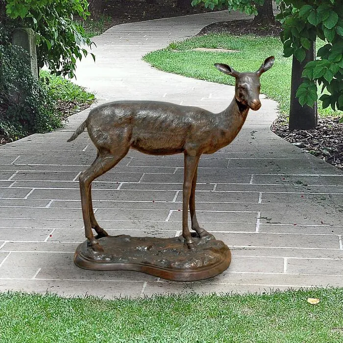 When you see this solid bronze mother doe deer statue take its place in your flowerbed, it will add the charm of the wild to your home or garden setting. Our impressive 360-degree, nearly four-foot-tall bronze animal statue boasts a stunning hand-applied multidimensional color-washed sepia patina. Cast and crafted one piece at a time in the traditional lost wax method, which highlights the detail of sculpt and guarantees lasting beauty. Sure to be a garden focal point, this Design Toscano heirloom-quality bronze mother doe deer statue conveys that you take the exterior of your home as seriously as the interior. 32"Wx25"Dx42½"H. 104 lbs.