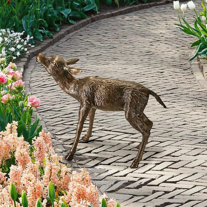 When you see this solid bronze baby fawn deer statue take its place in your flowerbed, it will add the charm of the wild to your home or garden setting. Our impressive 360-degree, nearly two-foot-long bronze animal statue boasts a stunning hand-applied multidimensional color-washed sepia patina. Cast and crafted one piece at a time in the traditional lost wax method, which highlights the detail of sculpt and guarantees lasting beauty. Sure to be a garden focal point, this Design Toscano heirloom-quality bronze baby fawn deer statue conveys that you take the exterior of your home as seriously as the interior. 23"Wx7½"Dx20"H. 14 lbs.