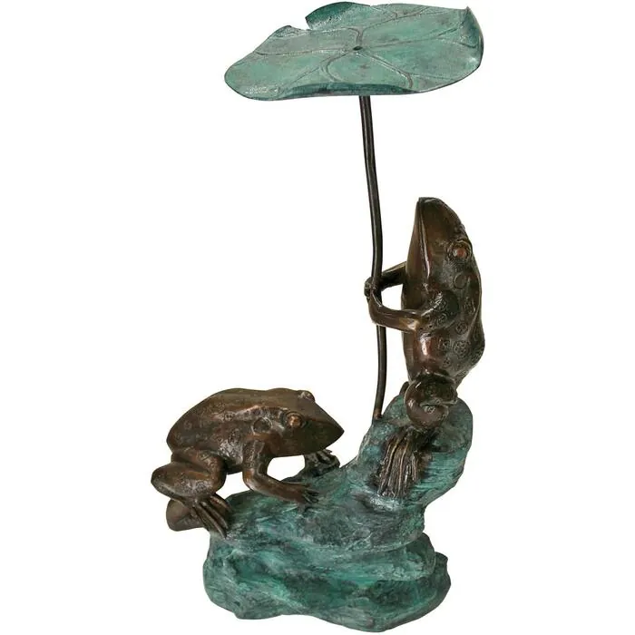 When you see this comical, piped bronze, frog statue seemingly "singing in the rain", it might just make you chuckle! Tucked between the flowers as a bronze garden sculpture or raining water straight into your backyard pond from their lily pad umbrella, our Design Toscano-exclusive heavyweight, bronze frogs statue is a fanciful addition to your favorite pond, fountain or flowerbed! Our spitting frog bronze statue boasts a hand-applied two-tone, classic sepia and emerald verde bronze patina. Cast and crafted one piece at a time in the traditional lost wax method which guarantees lasting beauty, this Design Toscano heirloom-quality bronze garden statue conveys that you take the exterior of your home as seriously as the interior. Piped to optionally cascade flowing water from the lily pad umbrella into your pond or fountain. Simply add the optional 120 GPH pond pump kit to create beautiful water music in your garden. Accommodates Toscano Pump Kit DR-120, sold separately. 10½"Wx6"Dx20"H. 16 lbs.