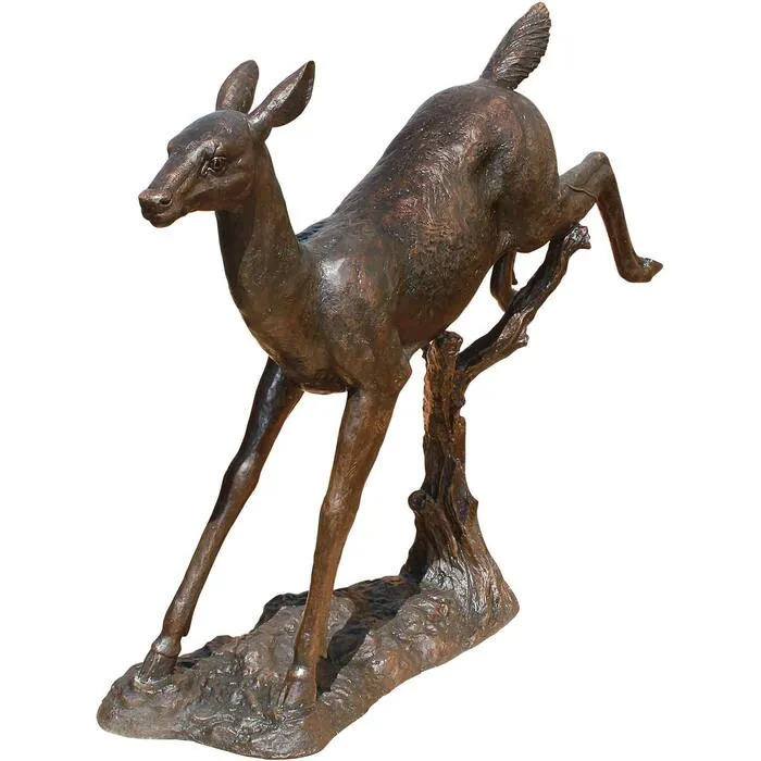 When you see this solid bronze leaping deer statue take its place on your estate, it will add the charm of the wild to your home or garden setting. Our impressive 360-degree, over-four-foot-tall bronze animal statue boasts a stunning hand-applied multidimensional color-washed sepia patina. Cast and crafted one piece at a time in the traditional lost wax method, which highlights the detail of sculpt and guarantees lasting beauty. Sure to be a garden focal point, this Design Toscano heirloom-quality bronze leaping deer statue conveys that you take the exterior of your home as seriously as the interior. 60"Wx18½"Dx50"H. 136 lbs.