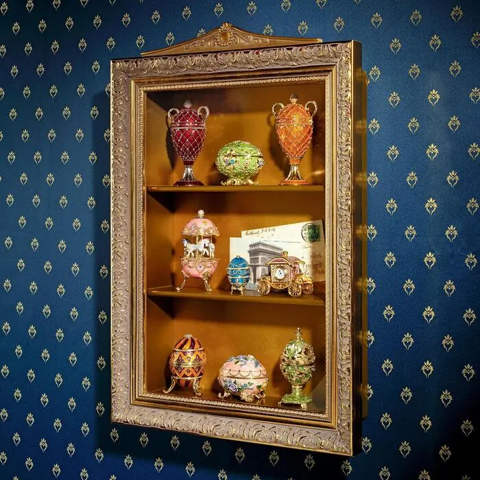 Good enough for the Tsar! Inspired by Design Toscano's extensive collection of timeless enameled eggs, the elegant golden wood, hardwood curio cabinet with framed glass door was designed to fit most of Toscano's jeweler-style, museum quality Romanov Collection eggs. Surrounded by a frame of brushed gold and crowned with a classic wreath and ribbon detail, this stylish cabinet was designed to hang on a wall or rest freestanding on a tabletop. This three shelved wall curio cabinet will grace any decor, entry, hallway or office. Sits regally on a tabletop or hangs on the wall, a perfect way to display your own royal treasures. 16½"Wx6"Dx18½"H. 10 lbs.