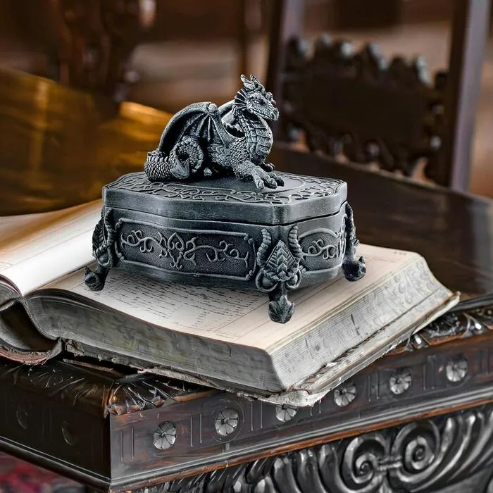 Drawing upon the childhood story of a dragon who protected the coffers of his village, British artist Liam Manchester sculpted this wonderfully detailed creature and set it atop an equally impressive claw-footed box. His fierce dragon will protect your treasures inside this box cast of designer resin. 6"Wx5"Dx6"H. 1 lb.