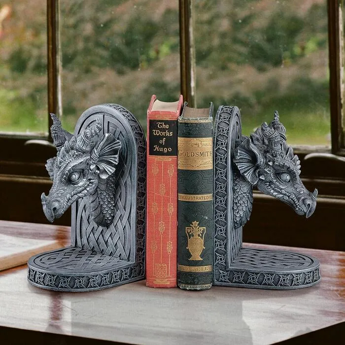 This pair of dragon bookends will try its best to keep books safe from unwelcomed borrowers! Cast in designer resin to capture the exquisite detail of the sculpt, spiraling horns and menacing faces sit atop a myriad of traditional Celtic crosses. Felt bottomed to protect your fine furniture, these are perfect for gift giving. (Set of Two) 4"Wx4½"Dx7½"H. 2 lbs.