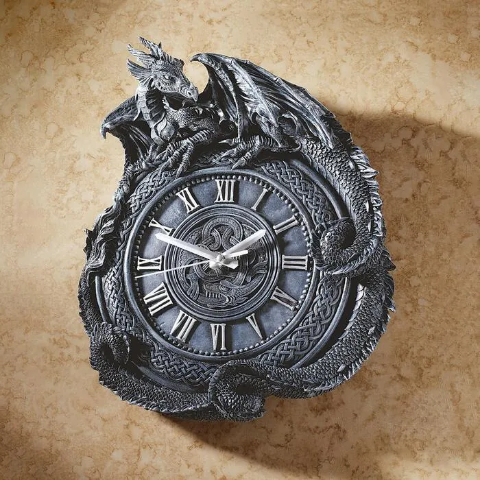 The longer we look at it, the more we admire the detail of this intricately sculpted, Celtic knot clock from one of Britain's most creative dragon aficionados. From atop his perch, the dragon wraps his long tail around a striking stone gray, designer resin clock featuring Roman numerals, a sweep second hand and quality quartz movement. 14"Wx4"Dx17½"H. 6 lbs.