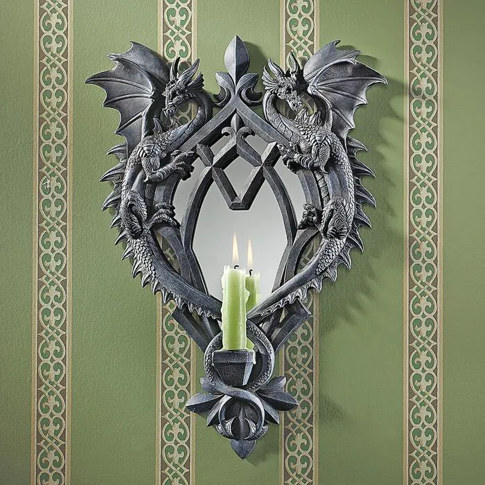 Conjuring visions of Gothic architecture, this magical, mirrored wall sculpt boasts a double dragon lair with gracefully furled tails that hold a flickering tealight candle. Artist Liam Manchester cast our Medieval protectors in quality designer resin exclusively for Toscano. 12½"Wx2½"Dx17½"H. 5 lbs.