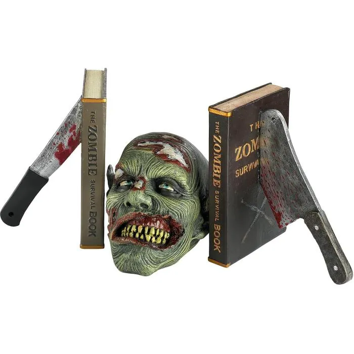 If you have the bug for books, your zombie virus is going to multiply like the plague for this pair of biohazard bookend sculptures! Perfect for the zombie hunter who has everything, these books were on a dead walk before being impaled by the bite of the blade. Created exclusively for Design Toscano s own zombie apocalypse, these macabre works of walking dead art are cast in quality designer resin and hand painted in horror house hues. A great gift for your favorite reanimated life form! Zombie head not included. Overall 11 Wx5 Dx7 H. 5 lbs.