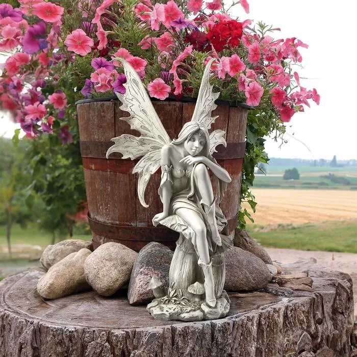 Share the vision! Though she may seem lost in daydreams, our newest fairy statue is actually hard at work envisioning your beautiful future. Exquisitely sculpted from the pointed boots covering her delicate ankles to the wispy feathered wings that envelope the curves of her shoulders, this fairy figurine leans into tomorrow with pensive passion and magical meditation. Cast in quality designer resin with a two-tone finish worthy of this introspective angel, our almost two-foot tall Design Toscano original is at home as the centerpiece of an indoor credenza or as an outdoor garden statue. A beautiful and hopeful gift! Simple assembly required. 11"Wx11"Dx22"H. 8 lbs.