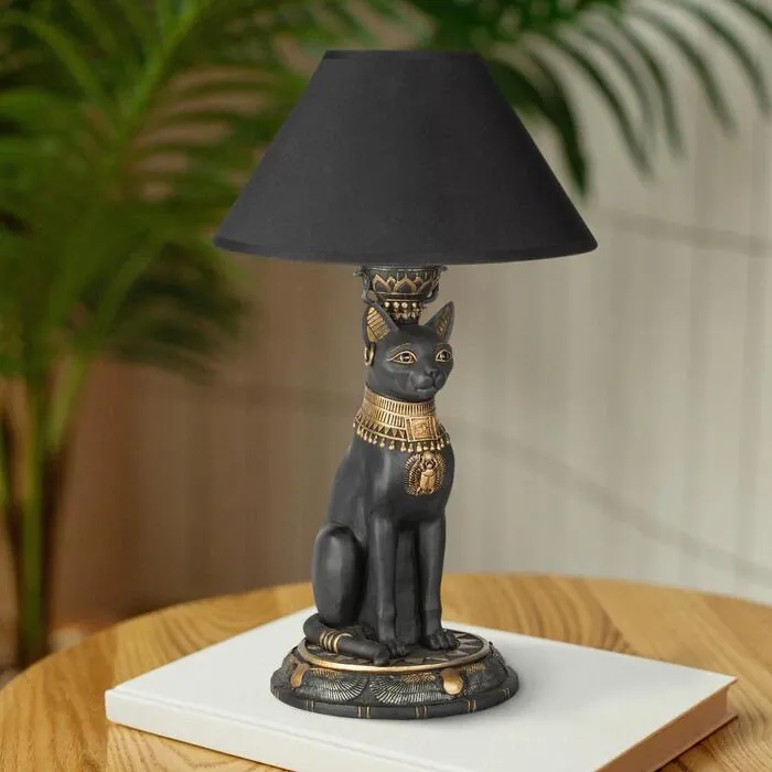 Shed new light on the Egyptian cat goddess Bastet with this fine feline sculpt fashioned into a dramatic and quite mesmerizing table lamp! Rising from a base inscribed with Ur-Uatchti, winged sun disks to protect against evil, the clear-eyed Bastet basks in a warm glow beneath an ebony fabric shade. Cast in quality designer resin to capture details from the scarab at her collar to the gold ring in her ear, our Design Toscano-exclusive work of functional art is individually hand painted in ebony and metallic hues. Both cat lovers and Egyptophiles are purring for this newest work of feline collectible decor! Switch on cord; accepts your 40-watt bulb. Each: 10 Wx10 Dx16½ H. 3 lbs.