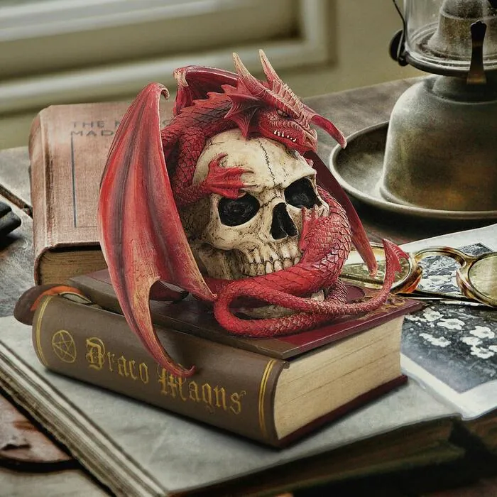 None will guess that your hidden treasure is cleverly (and safely) concealed in the liftable lid of the Book of Hours! Full of wickedly Gothic detail, the artist's work reveals a winged, spiny-tailed blood dragon wrapping himself around a truly menacing skull. Cast in quality designer resin, it is exquisitely hand-painted with a touch of Medieval magic! 7½"Wx7½"Dx8½"H. 3 lbs.