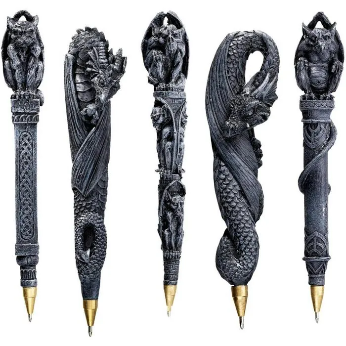 Your next poison pen letter - or even the next proposal you draft - is sure to have extra power when you render it with our pens boasting dragons and gargoyles! You'll enjoy the impressive sculpting of each work cast in quality designer resin and finished in faux greystone. Great as a gift to yourself or any lover of all things medieval. (Set Includes: Alalric, Blackburn, Chauncey, Dermott & Edric) Each: 6½"L.