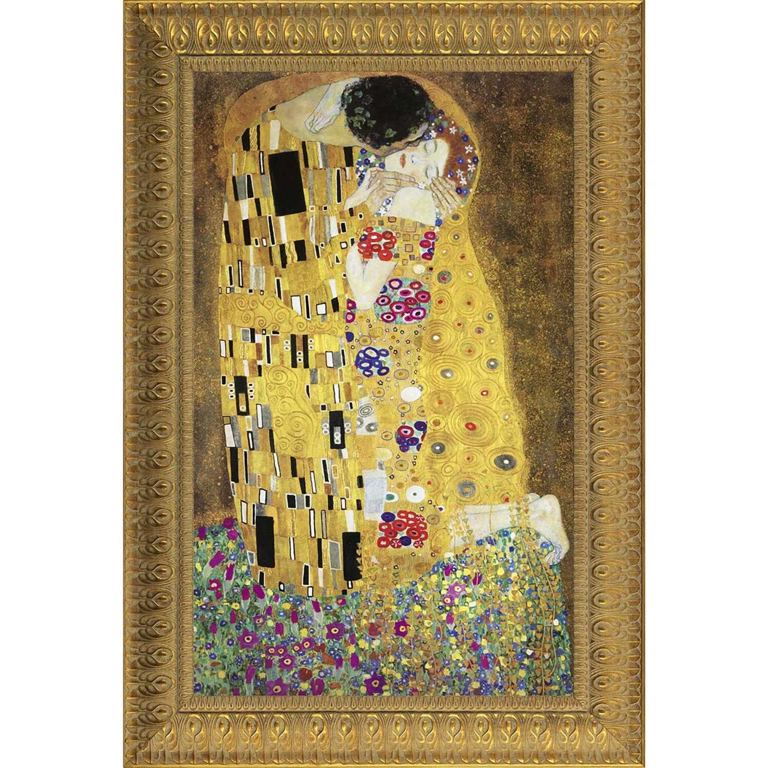 In "The Kiss" (1908), a pair of entranced lovers embraces in a stylized meadow studded with flowers on a background reminiscent of Byzantine icons. Austrian Klimt, known for sumptuously decorative scenes, creates highly distinctive displays of extraordinarily lush sensuality. Our authentic stretched canvas replica captures the original painting's texture, depth of color, and even its brushstrokes, which are applied by hand. It is surrounded by our imported, antique gold-toned, delicately sculpted 4" wide designer resin frame with a leaf motif. Proudly printed and framed in the USA using imported molding. Small: 19.5"Wx25.5"H framed (12"Wx18"H image size, 4"W frame), 6 lbs.
