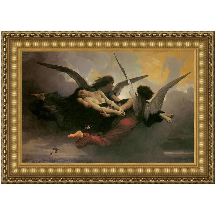 With a tenderness that comforts, two majestically-winged angels carry a dear departed soul through the clouds and toward the light. While mourning the loss of both sons and his wife within a two-year period, Frenchman Bouguereau turned his creative energies and his love for rich color toward this cathartic work that continues to soothe well into its second century. The authentic stretched canvas replica painting captures the original work's texture, depth of color, and even its subtle brushstrokes, which are applied by hand exclusively for Design Toscano. Our replica 4.375" wide, European style, bright gold-toned, ribbed frame is cast in quality designer resin with an acanthus leaf and floret border that draws the eye toward the beautiful image. Proudly printed and framed in the USA using imported molding. Small: 17.25"Wx14.25"H framed (9"Wx6"H image size, 4.375"W frame), 4 lbs.