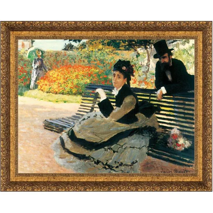 This is one of Monet's rare genre-style works. His wife Camille is arranged on a bench with a distinct look of grief on her face, depicting her deep sadness over the loss of her father which occurred in September, 1873. The man in the picture was identified by Monet himself as a neighbor visiting at the time to share his condolences, bringing with him a note and gift bouquet, seen next to Camille on the bench. The authentic stretched canvas replica painting captures the original work's texture, depth of color, and even its subtle brushstrokes, which are applied by hand exclusively for Design Toscano. With bas-relief organic styling, the multi-tiered, replica European style 3.25" wide frame is cast in quality designer resin and highlighted with an aged gold-toned finish. Proudly printed and framed in the USA using imported molding. Grande: 47"Wx37"H framed (41"Wx31"H image size, 3.25"W frame), 11 lbs.
