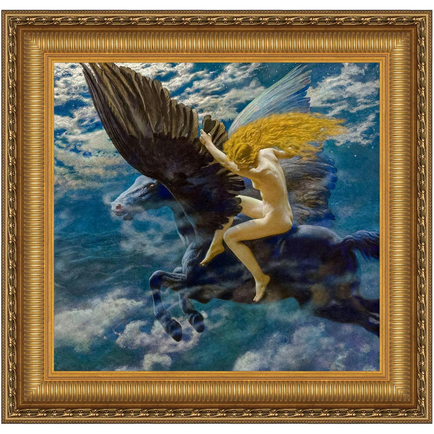 This vivid image of a Valkyrie from Norse mythology chooses to fly into battle straddling the world between life and afterlife as a guide to Valhalla for fallen Viking warriors. This strange, seductive scene depicts a nubile rider grasping the great black wings of her flying steed shimmering in the moonlight mysterious and otherworldly amid the play of contrasting shapes, space and light and shadows created with gouache and pastels. "Dream Idyll" is considered his tour de force of execution. English artist Hughes attended the Royal Academy School he also worked as a studio assistant to Pre-Raphaelite Brotherhood founding member William Hunt. His own work was in Aestheticism, worked in watercolors and oils using romantic interpretations of old myths, tales and legends. The authentic stretched canvas replica painting captures the original work's texture, depth of color, and even its subtle brushstrokes, which are applied by hand exclusively for Design Toscano. Our replica 4.375" wide, European style, bright gold-toned, ribbed frame is cast in quality designer resin with an acanthus leaf and floret border that draws the eye toward the beautiful image. Proudly printed and framed in the USA using imported molding. Medium: 22.25"Wx23.25"H framed (14"Wx15"H image size, 4.375"W frame)