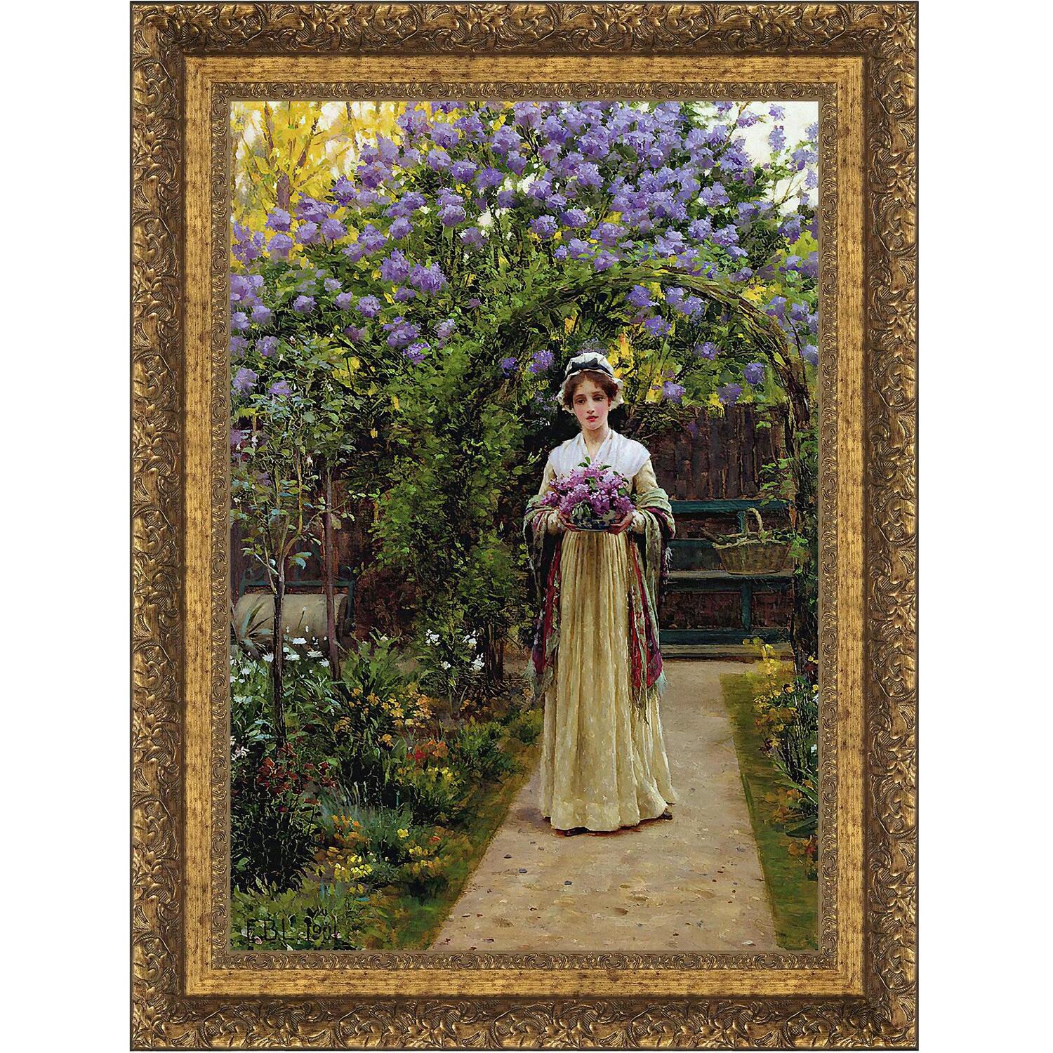 The sunlight filters softly through the arching branches of abundant blooming lilacs, denoting the joy of youth and a sign of spring. Painted in a dreamlike Pre-Raphaelite style, this charming Victorian lady has arranged a lovely bowl of lilacs cut from the lush blossoming garden. Leighton's work bridged the commercial and critical divide earning a place in the Victorians' hearts. Famous for his romantic and vivid, Edwardian and Medieval compositions artist Leighton drew inspiration from historic eras, literature, romance and the Pre-Raphaelite movement. The authentic stretched canvas replica painting captures the original work's texture, depth of color, and even its subtle brushstrokes, which are applied by hand exclusively for Design Toscano. With bas relief organic styling, the multi-tiered, replica European style 3.25" wide frame is cast in quality designer resin and highlighted with an aged gold-toned finish. Proudly printed and framed in the USA using imported molding. Grande: 36"Wx49"H framed (30"Wx43"H image size, 3.25"W frame)
