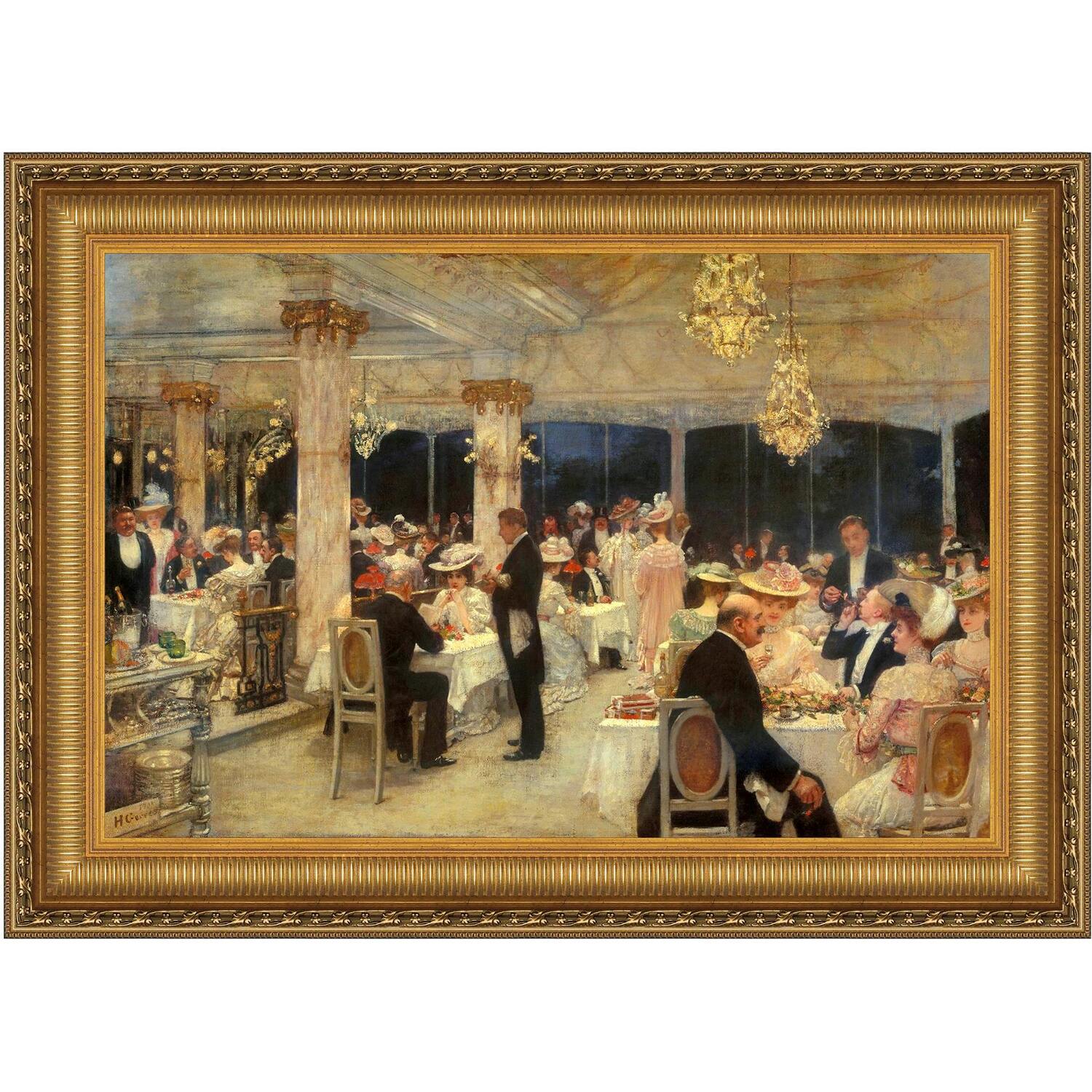 The highlight of Paris in the Bella epoque era was the Grand Prix horse race at Longchamp. Afterward the fashionably dressed gathered for dinner at the Armenonville Pavilion, a sparkling restaurant on the shore of Bois de Boulogne, bringing together the many of the beautiful people and varied personalities and classes including the pictured notorious Spanish actress and dancer, La Bello Otero star of the Folies-Bergere. Gervex, sometimes considered an Impressionist, was also an academic and classically trained painter who favored larger works including wall panels. On one of his many travels, Gervex was commissioned to paint portraits of the Czar Nicholas II and the Russian royal family. The authentic stretched canvas replica painting captures the original work's texture, depth of color, and even its subtle brushstrokes, which are applied by hand exclusively for Design Toscano. Our replica 4.375" wide, European style, bright gold-toned, ribbed frame is cast in quality designer resin with an acanthus leaf and floret border that draws the eye toward the beautiful image. Proudly printed and framed in the USA using imported molding. Small: 20.25"Wx16.25"H framed (12"Wx8"H image size, 4.375"W frame)