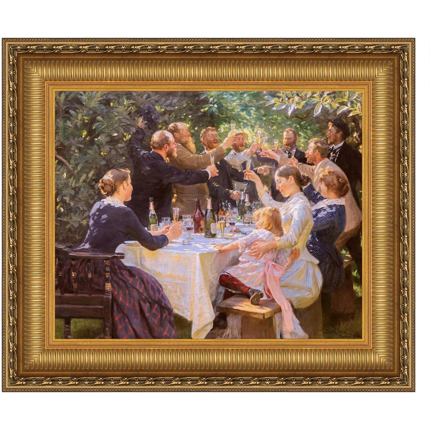 A remote fishing village in Denmark, Skagen was a gathering place for many Danish, Norwegian and Swedish artists. This celebratory party was a gathering of many artists, and friends and an important woman painter, Anna Archer with her daughter along with Kroyer himself painted in the white suit. The guests raise their glasses in a champagne toast as the sunlight sparkles off the glasses and the light glints, reflecting off the surrounding leaves. Norwegian-Danish painter Kroyer painted in the naturalist style but was influenced by contemporary Impressionists as he studied in Copenhagen, Paris and Leon and traveled extensively throughout his life. The authentic stretched canvas replica painting captures the original work's texture, depth of color, and even its subtle brushstrokes, which are applied by hand exclusively for Design Toscano. Our replica 4.375" wide, European style, bright gold-toned, ribbed frame is cast in quality designer resin with an acanthus leaf and floret border that draws the eye toward the beautiful image. Proudly printed and framed in the USA using imported molding. Medium: 25.25"Wx22.25"H framed (17"Wx14"H image size, 4.375"W frame)